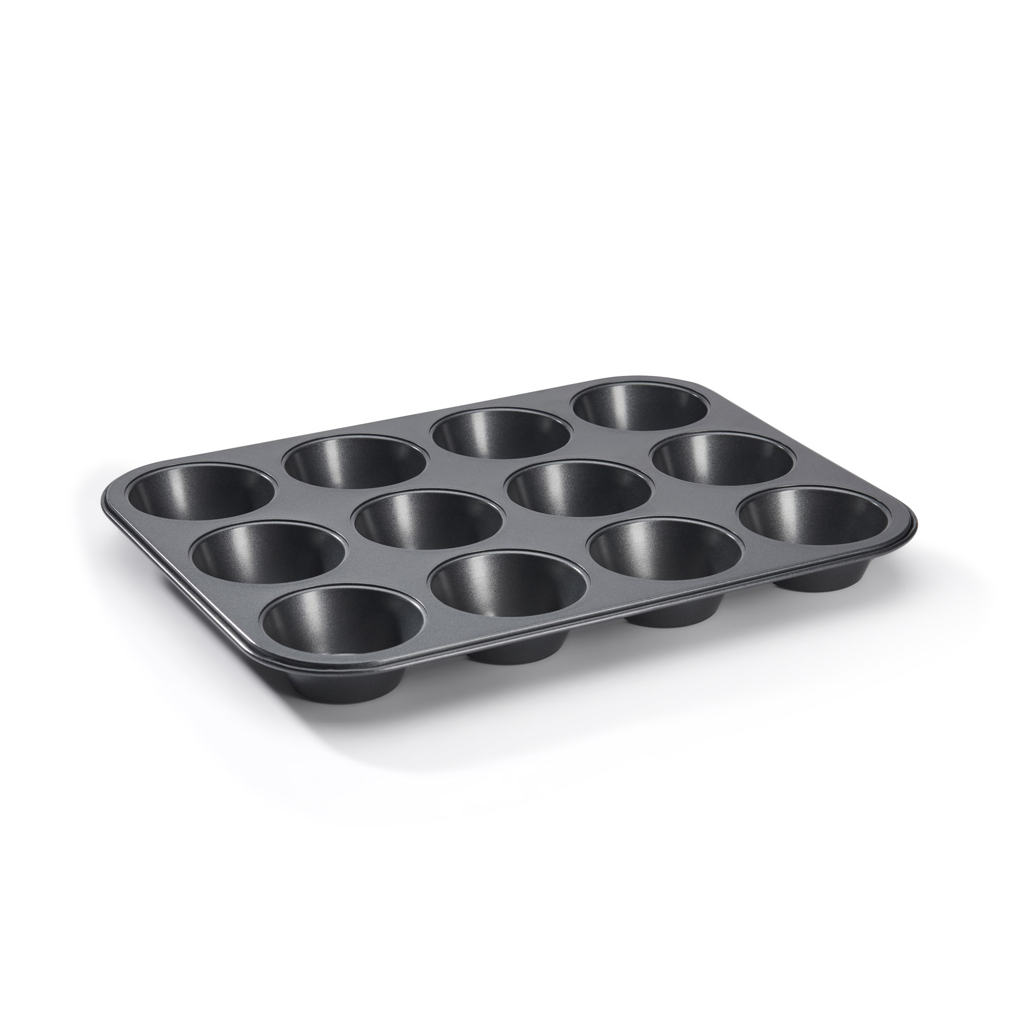 Silný ocelový těžký plech s 12 formami na pečení muffinů ((Ø dna: 5,3 cm; Ø horního okraje: 7,8 cm).