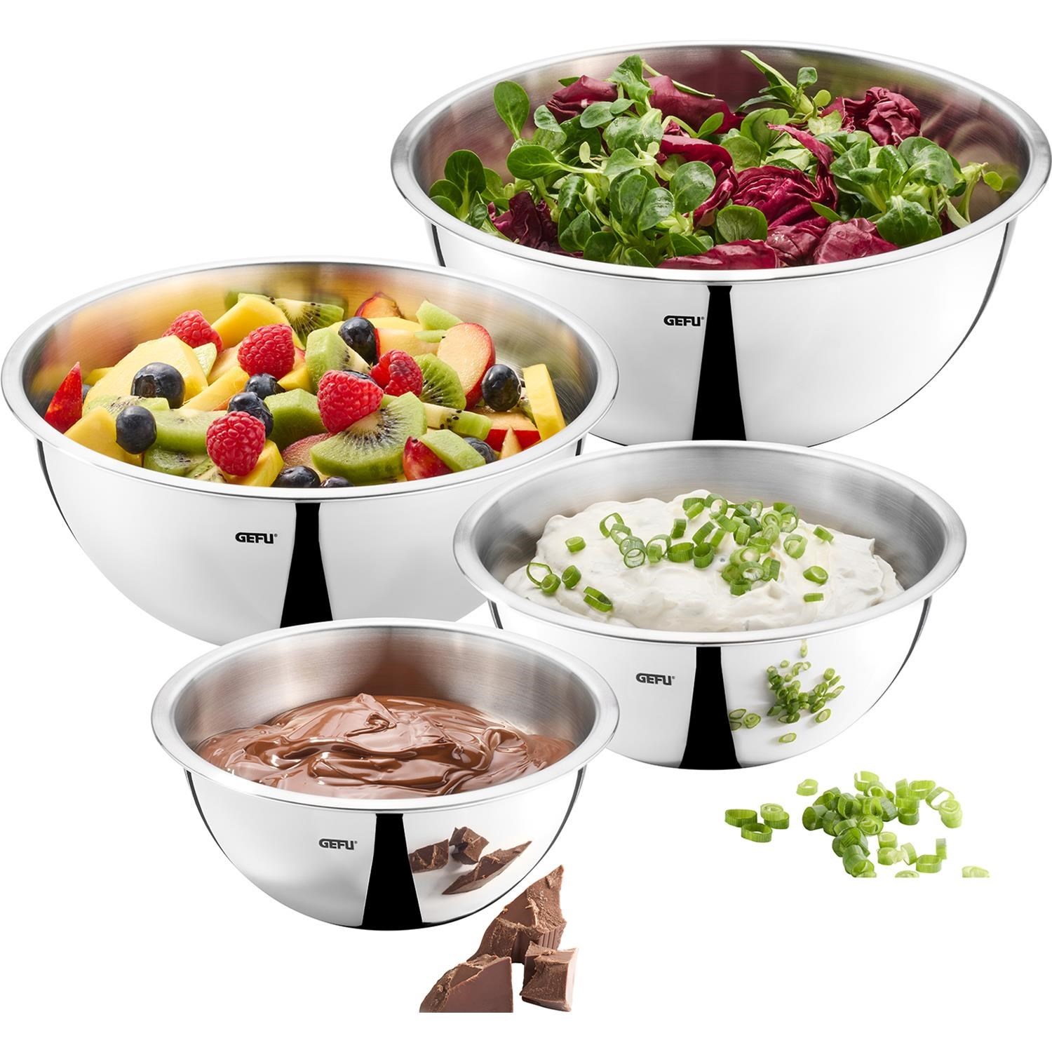 Velkoryse dimenzované a elegantní tvary misek nabízejí dostatek prostoru, ať už pro přípravu salátů, hnětení těsta nebo šlehání vajec a smetany. Díky praktickému a prostorově úspornému stohovatelnému designu se čtyři misky dokonale vejdou do sebe, což je činí multifunkčními a vhodnými pro jakoukoli kuchyňskou práci.